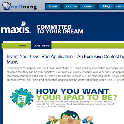 Love applications, be it on a Smartphone or Tablet for gaming, informative or educational purposes? Here's your chance to do so AND be rewarded for it! Use your creative juices to "invent" your own iPad application and you may be worth of winning a free 3g 64GB iPad each! There are 2 prizes up for grabs. Here's how the 2 winners are chosen: - The best idea (both creatively and technologically feasible) - The most creative idea (Your idea may be well ahead of the technology that is available today but WOW us and you can still win a free iPad from Maxis.) FIRST PRIZE : 1 x 3G 64GB Maxis iPad + WIFI Maxis Modem SECOND PRIZE: 1 x 3G 32GB Maxis iPad + WIFI Maxis Modem Hurry up Churpers! Contest ends on Friday, December 31, 2010!